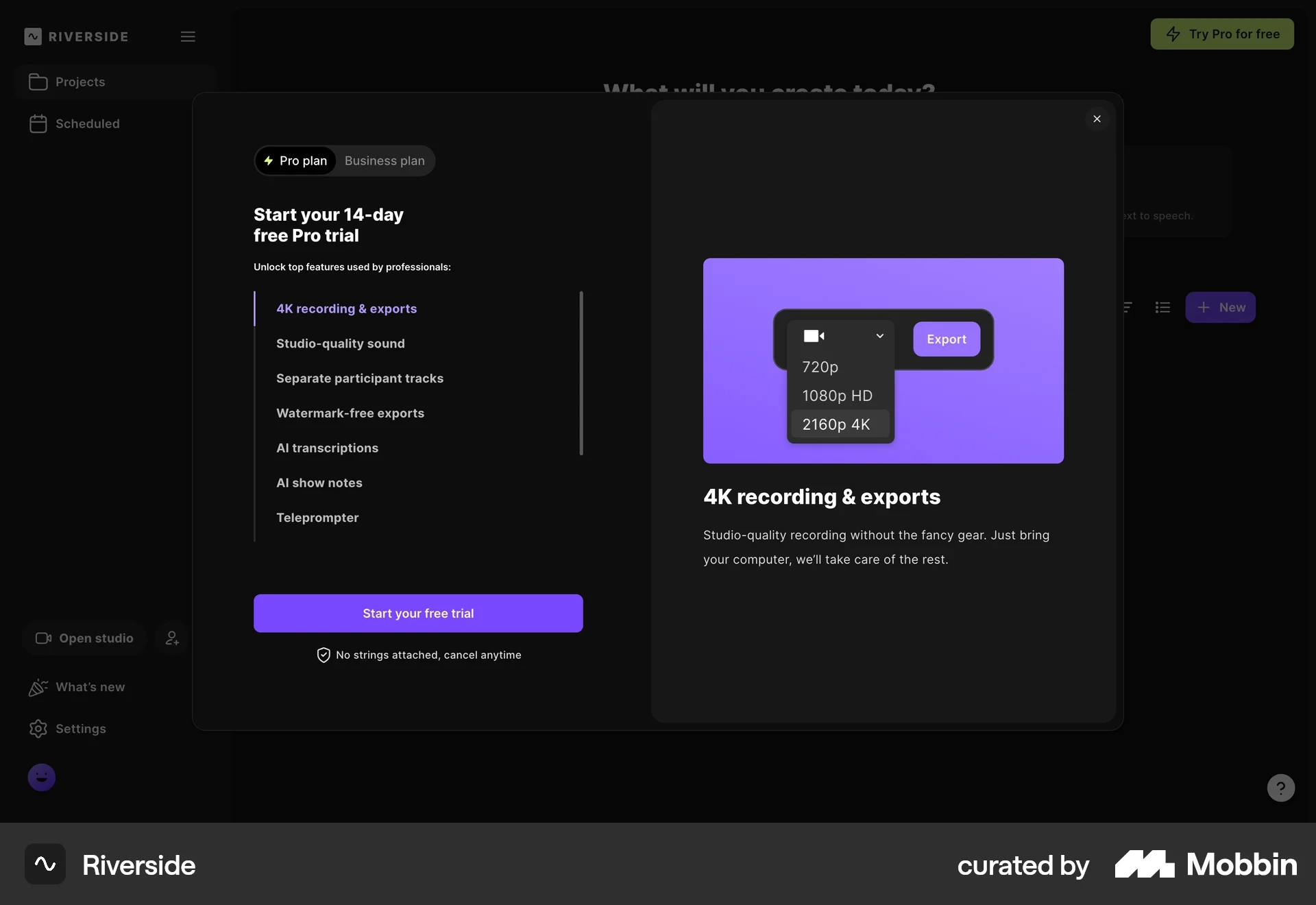 In Riverside, when a user tries to export high-quality video, a modal appears offering a 14-day Pro trial.