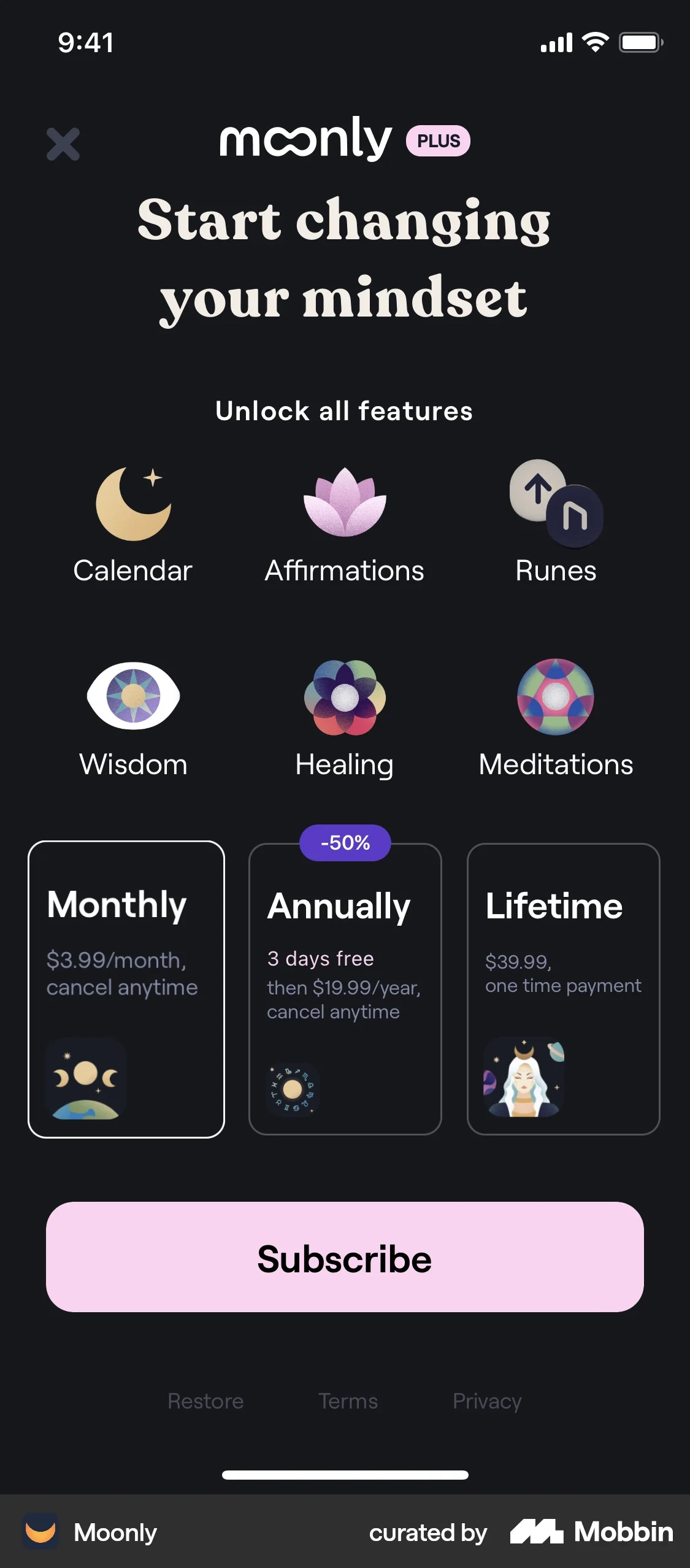 In this Moonly meditation app, the paywall highlights the premium experience up front.