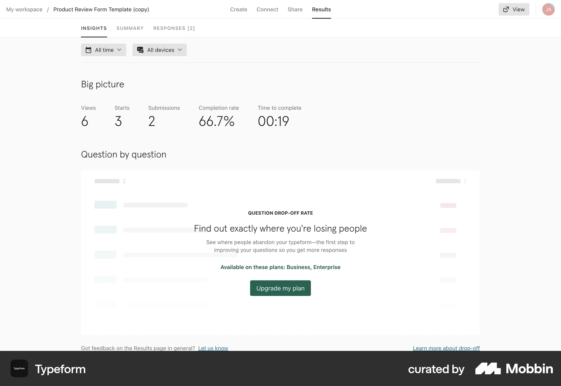 In Typeform's Insights dashboard, users can see basic analytics like views, submissions, completion rate, and time to complete.